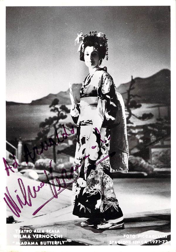 Italian soprano (b.1946), signed photo, shown as Puccini's Madama Butterfly, inscribed.  Photo by Piccagliani, La Scala, Milan. Size is 4 x 5.75 inches, in excellent condition.