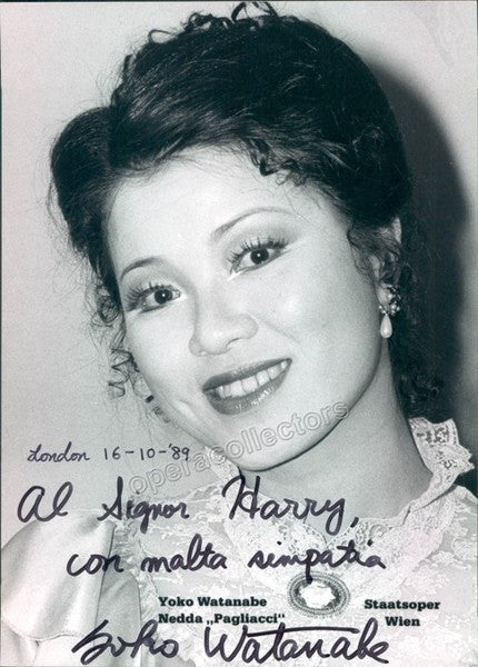 Japanese soprano (b.1953).  Signed photo shown as Nedda in Pagliacci; stamped on verso by photographer Victor Mory, Vienna.  Size is 5 x 7 inches, in excellent condition.