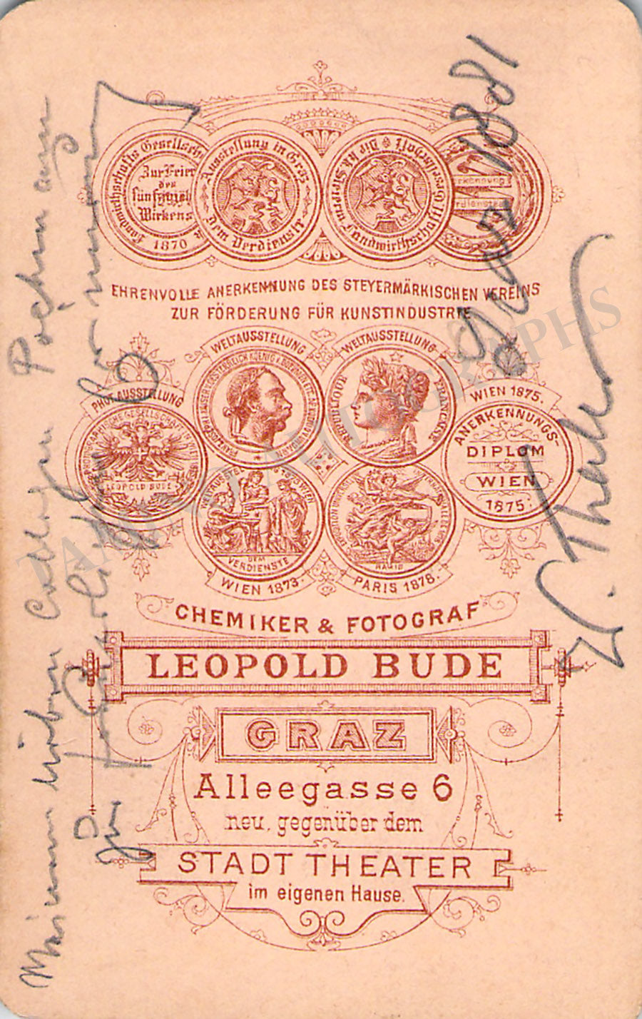 Fine carte-de-visite (CDV) photo of him by photographer Leopold Bude (Graz) signed by the artist on verso with a short sentiment dated 1881. Size is 2.5 x 3.7 inches, in overall very good condition.