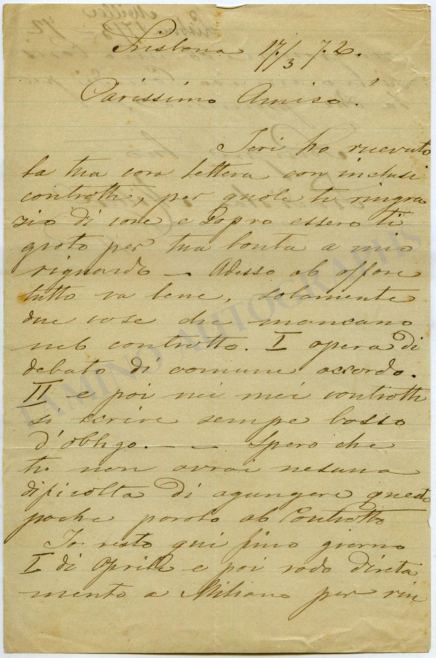 Autograph letter in Italian (untranslated) signed by him, dated in Lisbon, March 17, 1920, to an impresario: “…Ieri ho ricevuto la tua cara lettera con inclusi i contratti, per quale ti ringrazio…”. Size is 5.4 x 8.2 inches, 2 written pages in one sheet (front and back), overall age toning, creases and folds, in very good condition.