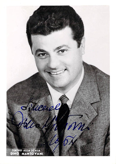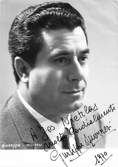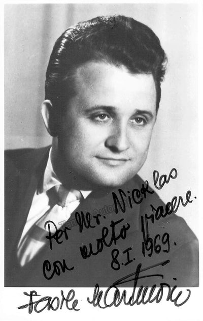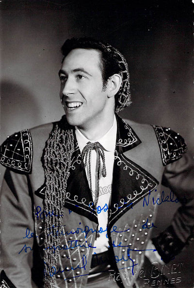 French tenor (1920-1992), signed promotional photograph, shown as himself, inscribed. Size is 5.25 x 8.25 inches, several creases and bends, otherwise in good condition.