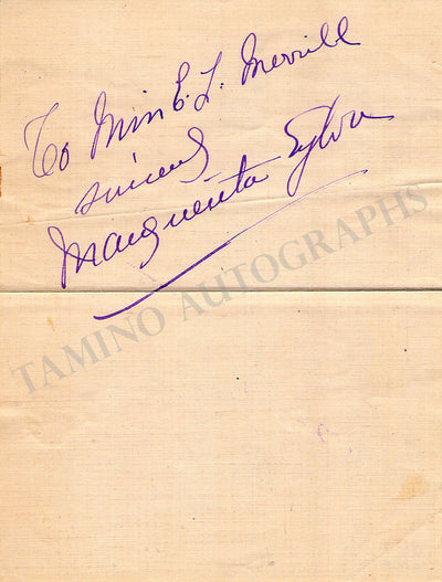 Spanish soprano (1889-1973). Fine card signed and inscribed by her in 1924 attached with a small half-tone photograph of her. Size is 8.3 x 3.4 inches, in excellent condition.