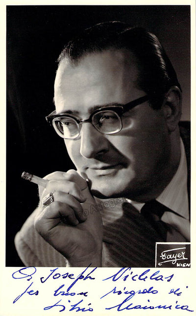 Austrian baritone (b. 1929), signed postcard photograph, shown as himself, signed on front with inscription on verso. Photo by Stockel and company, Hannover. Size is 3.5 x 5.5 inches, in excellent condition.