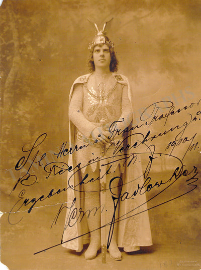 German tenor (1938-2000). Fine black-and-white photograph signed by him, shown as Lohengrin in Wagner's opera.  Size is 4 x 5.75 inches, sticker on verso by Georges Farret, ink mail stamp, in very good condition.