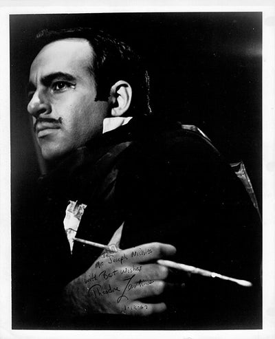 Peruvian tenor (b.1946), signed photograph, shown as Fenton in Verdi's Falstaff, inscribed. Stamped on verso by photographer Georges Farret, Marseille.  Size is 4 x 5.75 inches, in excellent condition.