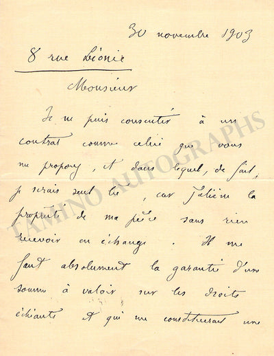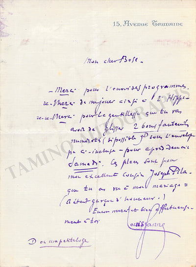 French tenor (1876-1950), who started his career well into his 30s and developed a very successful international career thanks to his beautiful voice and impressive stage appearance.  Two autograph letters signed, both written in French, sold untranslated. 1 item is sized at 4.5 x 5.5 inches, the other is 4.5 x 6 inches, slight paper loss on edges but generally in very good condition. Not sold separately.