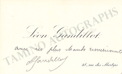 French tenor (1876-1950), who started his career well into his 30s and developed a very successful international career thanks to his beautiful voice and impressive stage appearance.  Signed card, written in French in 1919, sold untranslated. Size is 2.5 x 3.5 inches, in excellent condition.