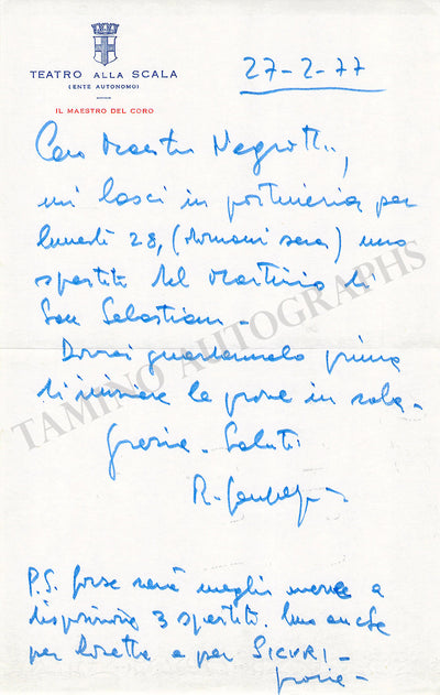 Italian tenor (1816-1887), who sung at the world premiere Caterina Cornaro, Alzira, Stiffelio and Un Ballo in Maschera. Autograph letter signed, dated in 1871, Paris, in Italian, sold untranslated. Size is 5.25 x 8.25 inches, one page, in excellent condition.