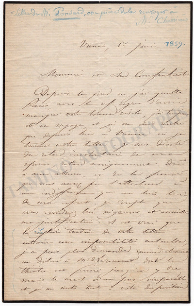 Franco-Maltese composer (1773-1818) who created many popular operas for the Opera Comique. Rare autograph letter signed, no date, in French, untranslated, to playwright and critic François-Benoît Hoffman (1760-1828). One page, 4.7 x 7.1 inches, folds, in very good condition.