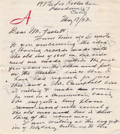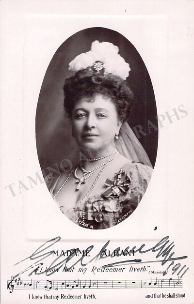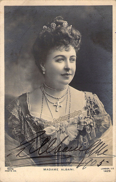 Canadian-British soprano (1847-1930) who had a very important international career during the late 1800s and early 1900s. Original autograph letters, typed letters, autograph notes, signature cuts, clips, cards, and album pages signed by the celebrated soprano in different sizes, lengths, and conditions (for more details please check individual descriptions). Scroll down to see all the autographs and click on each to enlarge or see more photos if available. SOLD INDIVIDUALLY.