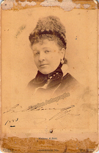 Star Canadian soprano (1847-1930), and one of the leading singers of the late 19th-early 20th centuries. Signed cabinet photograph, shown as herself, a photo by C.F. Conly, Boston. Size is 4.25 x 6.5 inches, mounting traces and rust above and below the photo and also on verso, not affecting image and signature, otherwise in good condition.