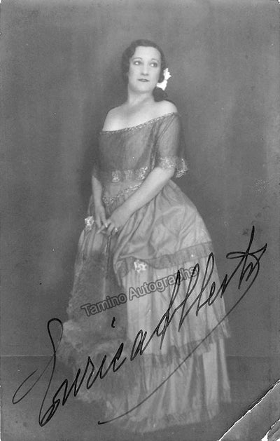 Italian-born American soprano (1909-2014), who sang at the Met Opera for over 25 years. Albanese was noted for her performances of Verdi and Puccini roles, later in her life worked to help young musicians and singers. Signed photograph, shown in the title role of Puccini's Madama Butterfly, size is 8 x 10 inches, in excellent condition. ALSO INCLUDED: signed Opera News magazine program/cast page of a 1958 radio broadcast of Puccini's La Boheme from the Metropolitan Opera, New York with her signature on the photo of her as Mimi. Size of each page is 6.75 x 10 inches, in very good condition, not sold separately.