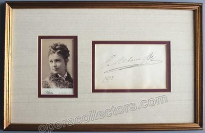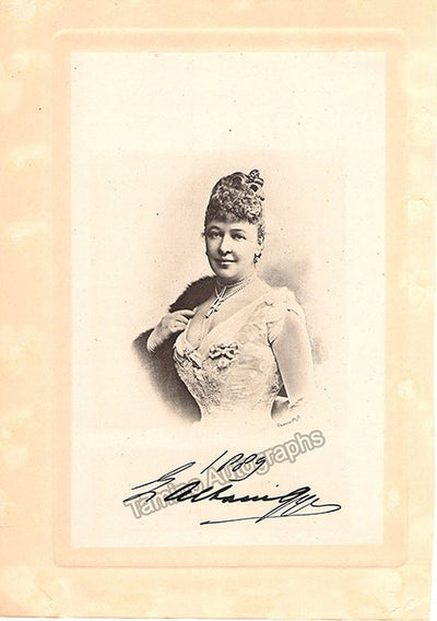 Star Canadian soprano (1847-1930), and one of the leading singers of the late 19th-early 20th centuries.  Signed photograph, shown as herself, dated in 1889. The 6 x 8.75 inch photo is mounted onto paper, total item size is 6.75 x 10 inches, vintage item in excellent condition.