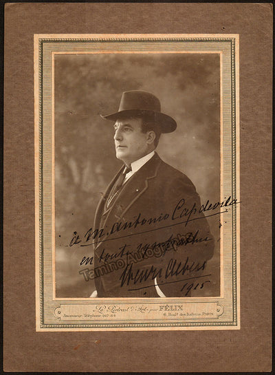 Dutch-born French baritone (1866-1926). Signed Autograph, shown as himself, inscribed and dated in 1915. Photo by Felix photography studio, Paris. 7 x 10 inch photo mounted onto soft cardboard, total item size is 9 x 12.25 inches, small bullet hole at top right of cardboard (not on the photo itself), otherwise in excellent condition.