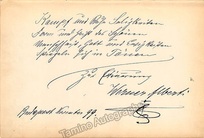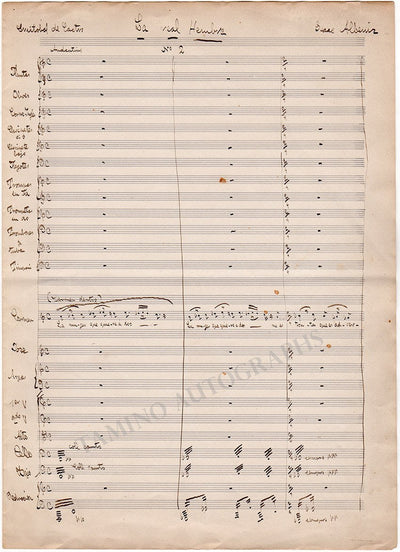Spanish composer and pianist (1860-1909), one of the greatest music creators from Spain in the post-romantic era.  Large autograph manuscript by his hand, one page from his unfinished work "La Real Hembra" (1902), a zarzuela (a Spanish lyric-dramatic genre that combines spoken and sung scenes with dancing). Albeniz only wrote the prelude and the 2 first scenes of this zarzuela before abandoning the project.  One page, 10.5 x 14.4 inches, minor stains, in very good condition. Autograph manuscripts of Albeniz are exceedingly rare in the market. Tamino Autographs is proud to offer this hard-to-find page from a music autograph score.