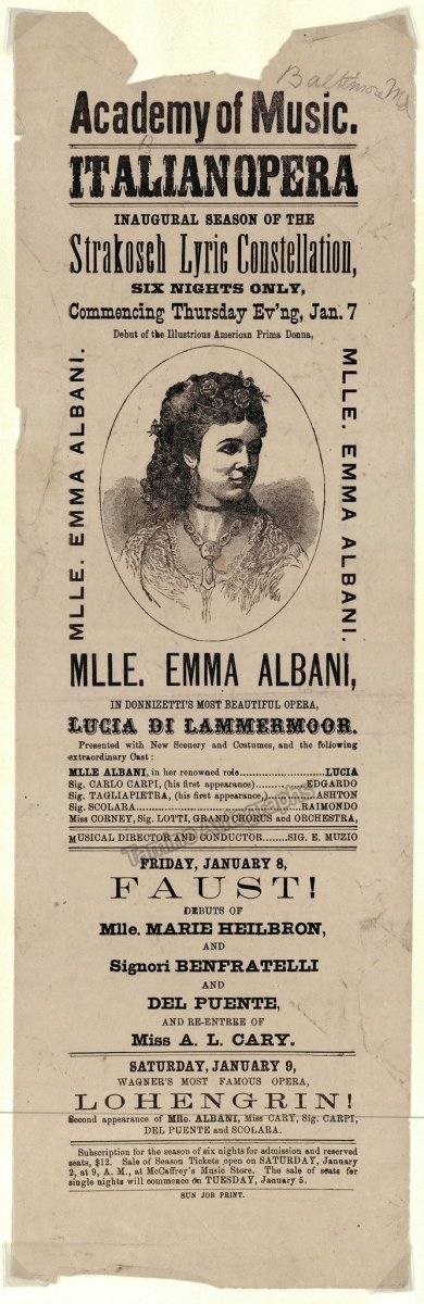 Star Canadian soprano (1847-1930), one of the greatest singers of her time. Playbill announcement for a performance at the Academy of Music in Baltimore, Maryland, of Lucia di Lammermoor. Year is not mentioned, but this was part of a USA tour she did in 1874 with the Strakosch Lyric Company and was her debut in Baltimore. Size is 6 x 19 inches, some loss of paper at the top border, otherwise in very good condition.