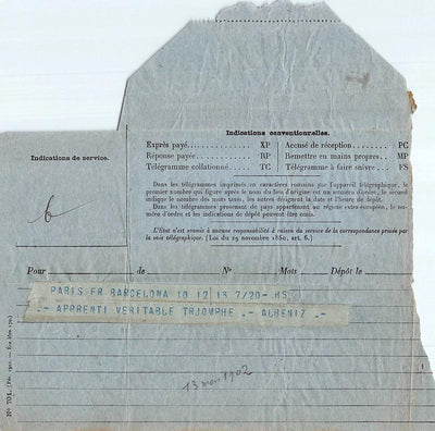 Spanish composer (1860-1909), and virtuoso pianist, greatly remembered for his works for piano, based on Spanish folk music. Telegram sent by him to French composer Paul Dukas (1865-1935), in French, with just 3 words (translated into English as "True Apprentice Triumph"), probably referring to the recent premiere of one of his works or someone else both composers know. Dated below in pencil 13 Mars 1902 (writing matches Albeniz´s handwriting). Size is 7.1 x 5.25 inches, plus the flap, in very good condition. See scans of both sides. Very rare!