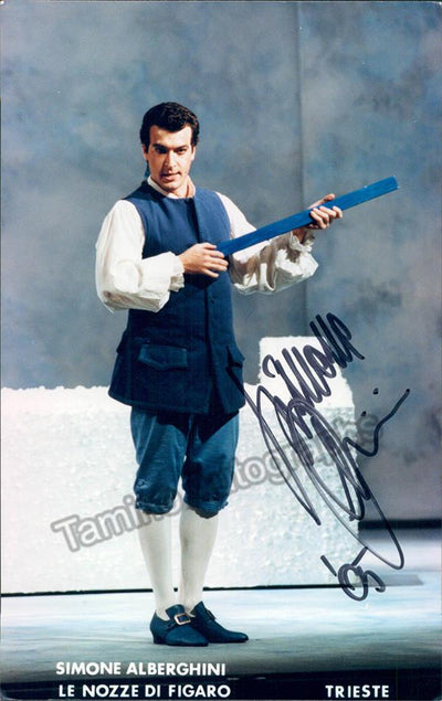 Italian bass-baritone (b. 1973), signed photo, shown in Le Nocce di Figaro, dated in 2005. Stamped on verso by photographer Visual Art Photo Studio, Trieste. Size is 4 x 6.25 inches.