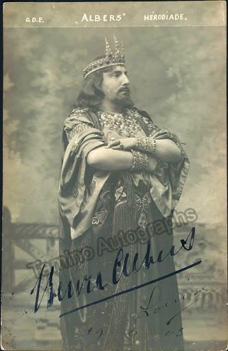 Signed photo of the Dutch-born French baritone (1866-1926) shown as Hérode in Massenet's Hérodiade, dated in 1905. Size 3.5 x 5.5 inches.