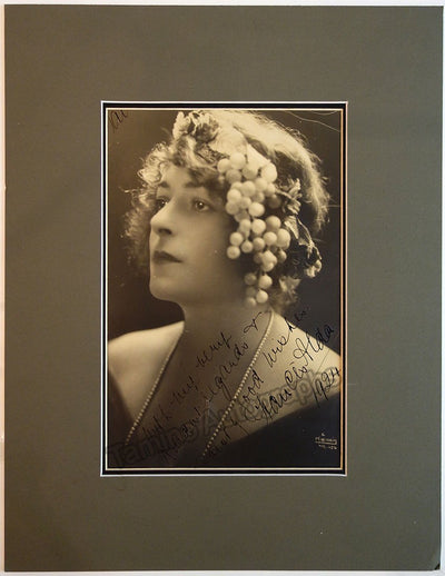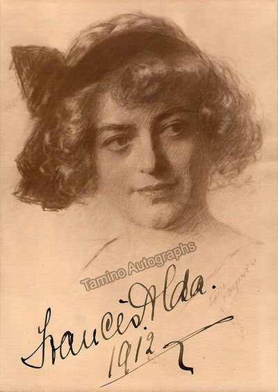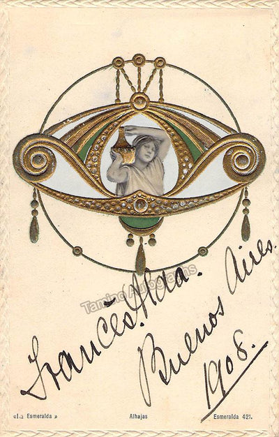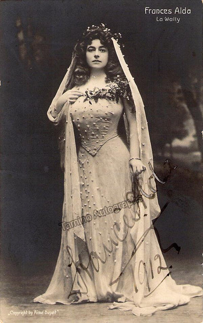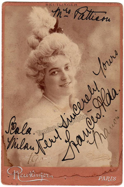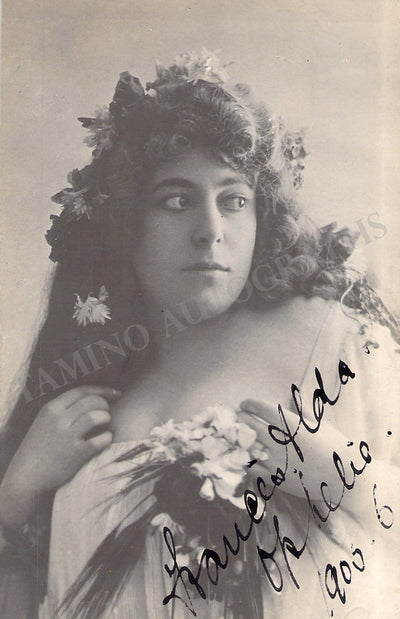 New Zealand-born, Australian-raised soprano (1879-1952), signed postcard, shown with half-tone photo of herself in role, surrounded by attractive gold spherical images, dated in Buenos Aires in 1908.  Size is 3.5 x 5.5 inches, in excellent condition.