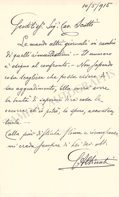 Italian musical bibliographer and researcher (1856-1930). Autograph letter in Italian (untranslated) signed by him and dated 1915. Size is 4.3 x 7.25 inches, 1 page, in excellent condition.