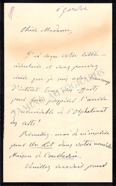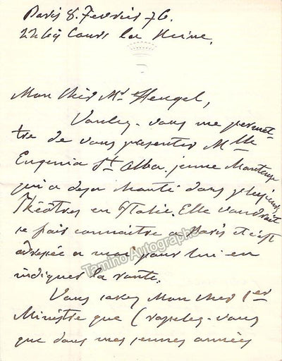 Italian contralto (1826-1894); considered one of the greatest contraltos in operatic history. Autograph letter in French (sold untranslated) signed by her, dated December 8, 1887.  Size is 4.25 x 9 inches, 1 page written on both sides, rust stains on the front, otherwise in excellent condition.