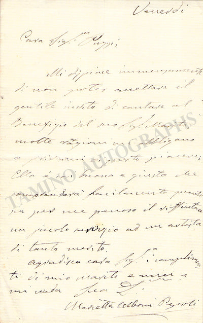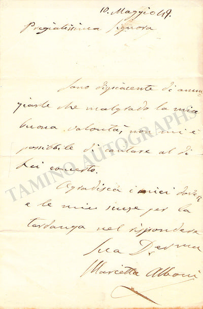 Italian mezzo-soprano/contralto (1826-1894), also known as Marietta Alboni-Pepoli. Autograph note in Italian (untranslated) signed by her and dated 1849, where she declines to sing at a concert. Size is 5 x 7.6 inches, 1 written page in 1 sheet, in excellent condition.