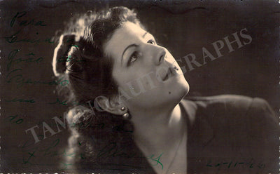 Spanish zarzuela soprano (1912-1967). Fine black-and-white photo postcard signed and inscribed by her on the front and verso. Size is 5.5 x 3.4 inches, image a bit faded on the front, verso in perfect condition, jagged edges, in overall very good condition.