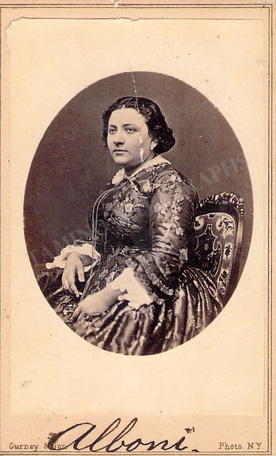 Italian contralto (1826-1894); considered one of the greatest contraltos in operatic history. Unsigned Carte-de-Visite (CDV) of the artist, shown as herself or in role, by J. Gurney and Son photographers, New York.  Size is 2.5 x 4 inches, pencil markings on verso, otherwise in excellent condition.