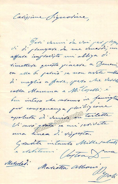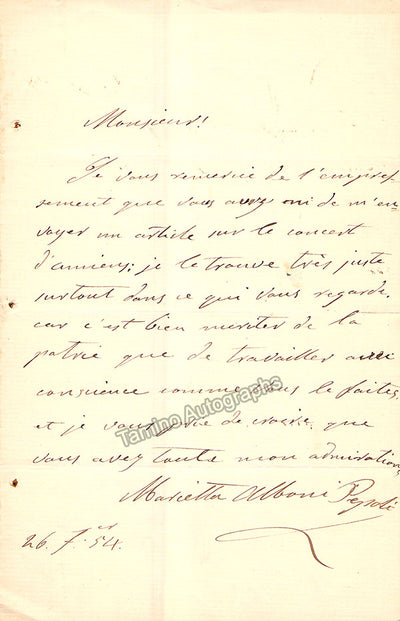 Italian mezzo-soprano/contralto (1826-1894), also known as Marietta Alboni-Pepoli. Autograph letter in Italian (untranslated) signed by her, no year. Size is 4.4 x 7 inches, in excellent condition.