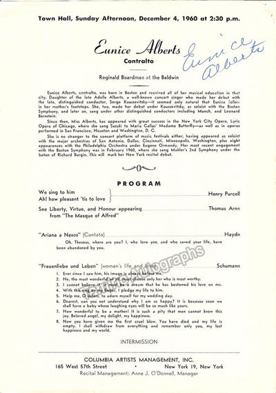 Program for a concert plus one-page insert for a concert in New York, 1960, signed  on page 2 by the American alto. Size is 6.75 x 9.75 inches, 4 pages, in very good condition.