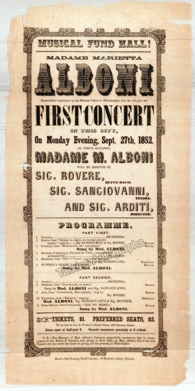 Famous Italian contralto (1824-1896), considered one of the greatest singers of all times. Playbill announcement for her debut concert in Philadelphia, Musical Fund Hall, Sept. 27th, 1852, with Luigi Arditi conducting. Size is 7.5 x 15.5 inches, some paper loss on borders, otherwise in very good condition, clean, with no rust.