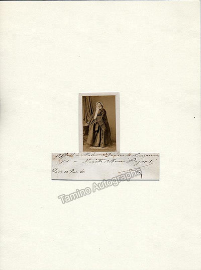 Italian mezzo-soprano/contralto (1826-1894), also known as Marietta Alboni-Pepoli.  Signed album page, inscribed and dated in Paris, 1860, plus a photo of her attached at the top.  Album page is mounted on a mat of 11.8 x 15.75 inches (can be easily removed), mounted with photo corners.  Actual album page is 8.5 x 12 inches, minor rust stains, otherwise in very good condition.