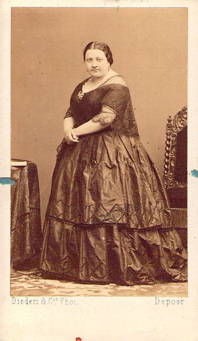 Famous Italian contralto (1824-1896), considered one of the greatest singers of all times. Unsigned CDV, shown possibly in role. Photo by Disderi. Size is 2.3 x 4 inches, small green spots surrounding the photo and small red speck beneath, otherwise in very good condition.