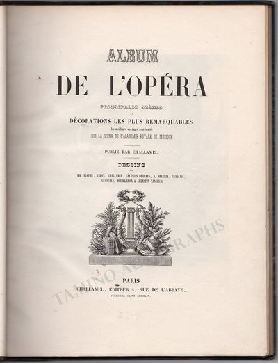 Published by Challamel, 48 pages with gorgeous hand-colored lithographs illustrating Romantic-era operas and ballets: Dumilatre and Coralli, Carlotta Grisi, Pauline Leroux, Georges Elie, Delphine Marquet, Lucien Petipa, Carlotta Grisi, Henri Despaces, Marie Taglioni etc.