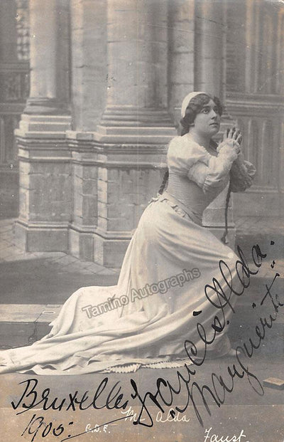 New Zealand-born Australian soprano (1879-1952), signed photo postcard, shown as Marguerite in Faust, Very rare historical photo, signed in Brussels dated in 1905. Photo by M. Wagener-Geraerts, editeur, Brussels. Size is 3.5 x 5.5 inches, in excellent condition.