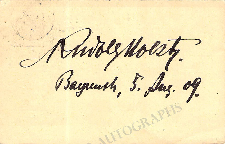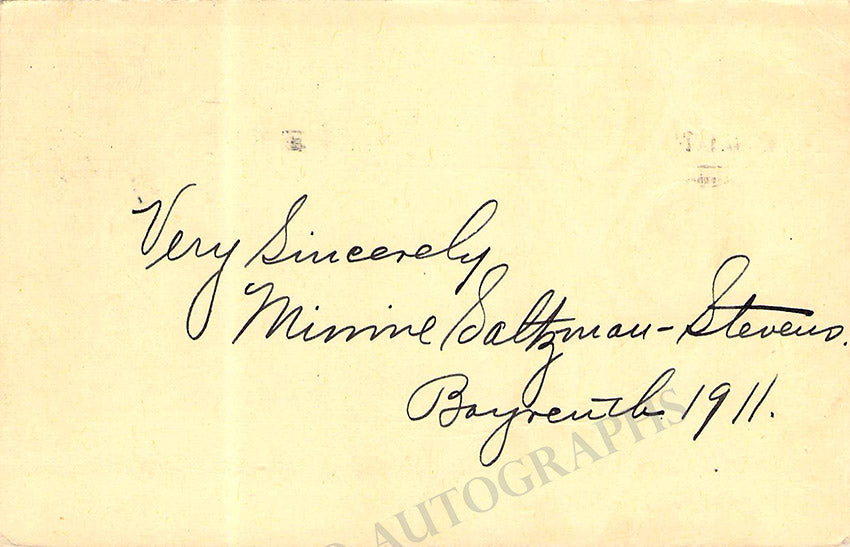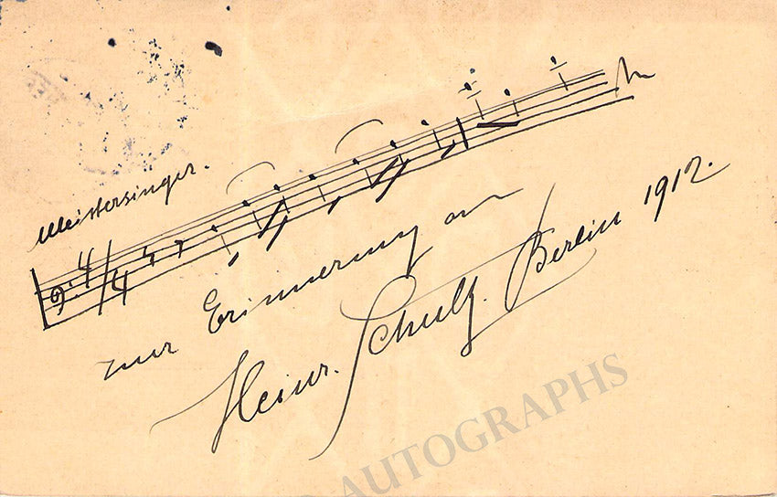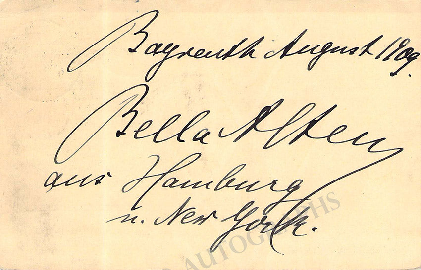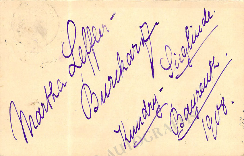 Nice collection of 10 postal cards signed by different artists who performed at Bayreuth Festival, including including Alois Hadwiger, Bella Alten, Heinrich Schultz, Hertha Dehmlow, Martha Leffler-Burckhardt, Minnie Saltzmann, Otto Briesemeister, Rudolf Moest.
