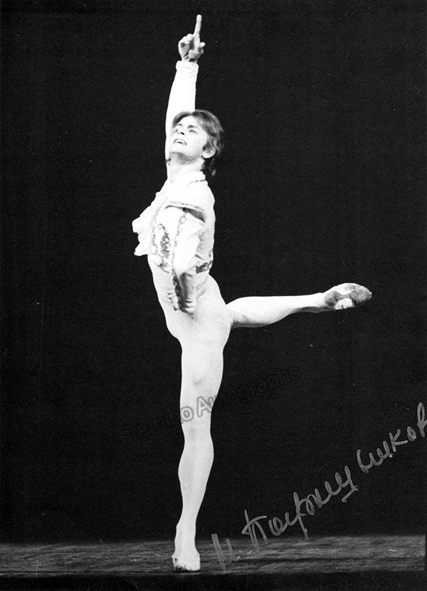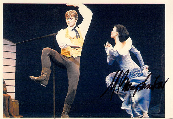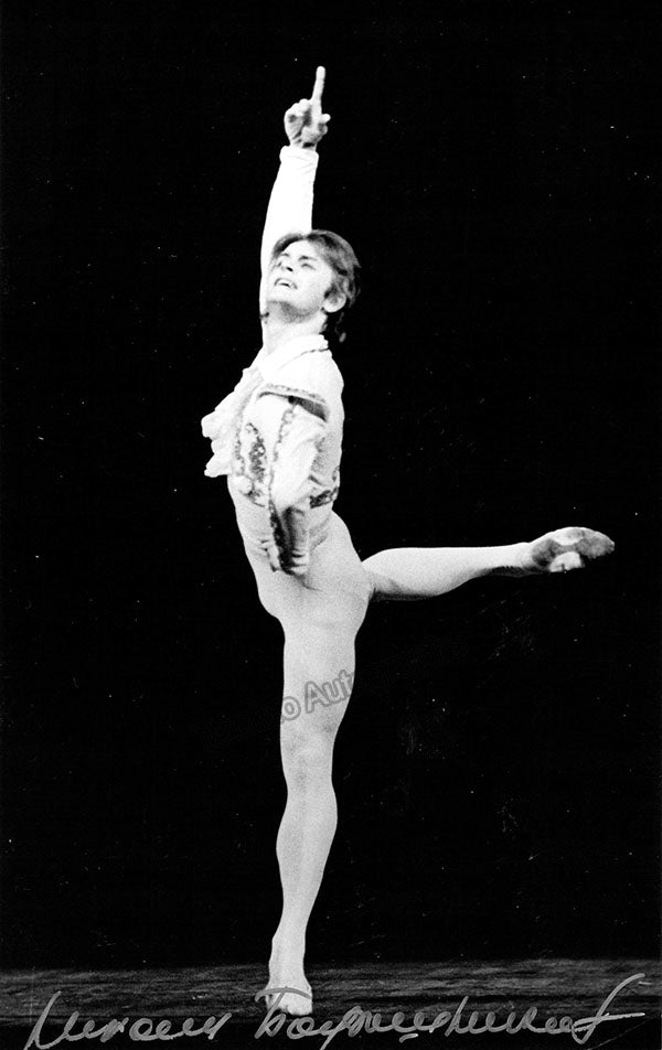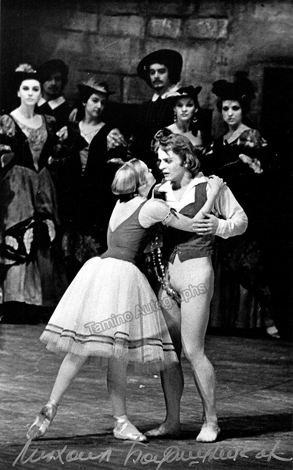 Beautiful black-and-white photograph signed by him, shown in performance next to Irina Kolpakova; ink-stamped on verso by photographer. Size is 6.6 x 9.2 inches, in excellent condition.
