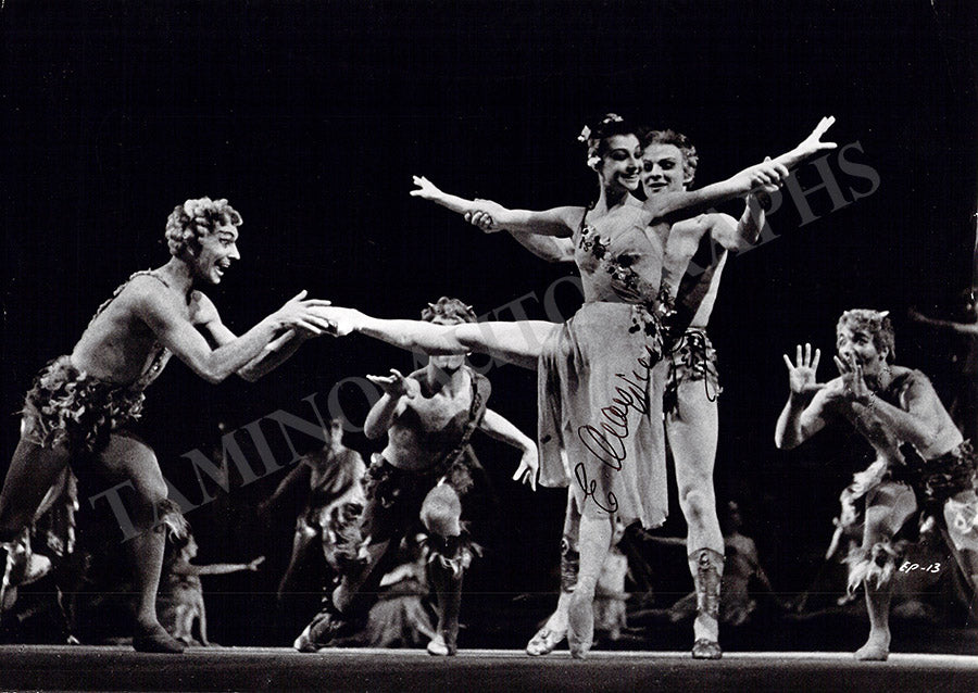 Beautiful black-and-white photograph signed by her, shown in performance in "Walpurgie Night" next to Vladimir Vasiliev. Size is 10 x 8.1 inches, in excellent condition.