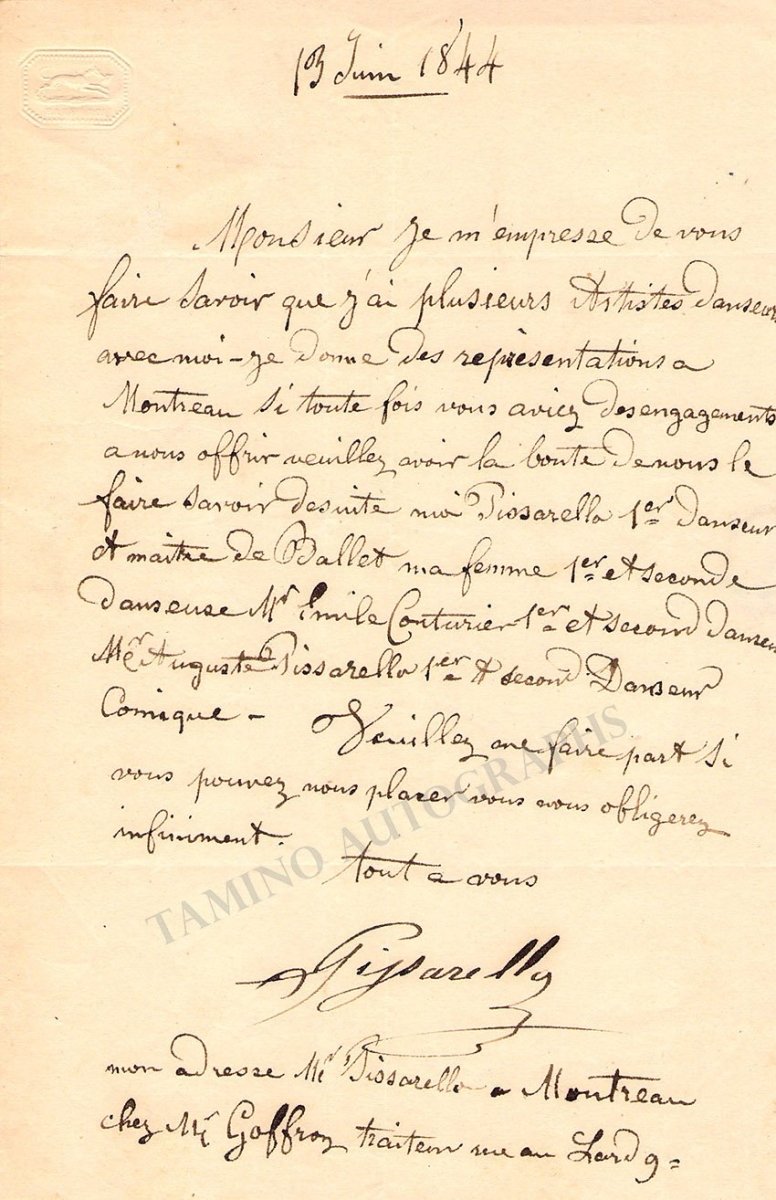 Italian dancer (1784-1866), choreographer and dance teacher. Autograph letter signed, written in french, dated in 1844. Size is 5.4 x 9.25 inches, one page, in excellent condition. Sold untranslated.