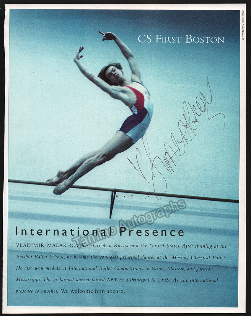 Beautiful half-tone photograph (full-page full-color advertisement from a Magazine) signed by the ballet dancer, shown dancing.  Size is 9.4 x 11.9 inches, left border irregularly cut, in excellent condition.