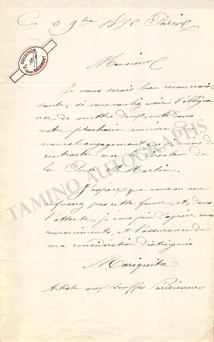 Autograph letter in French signed by her, dated 1896, sent to a gentleman about professional matters. Size is 5 x 8 inches, 1 page, in very good condition