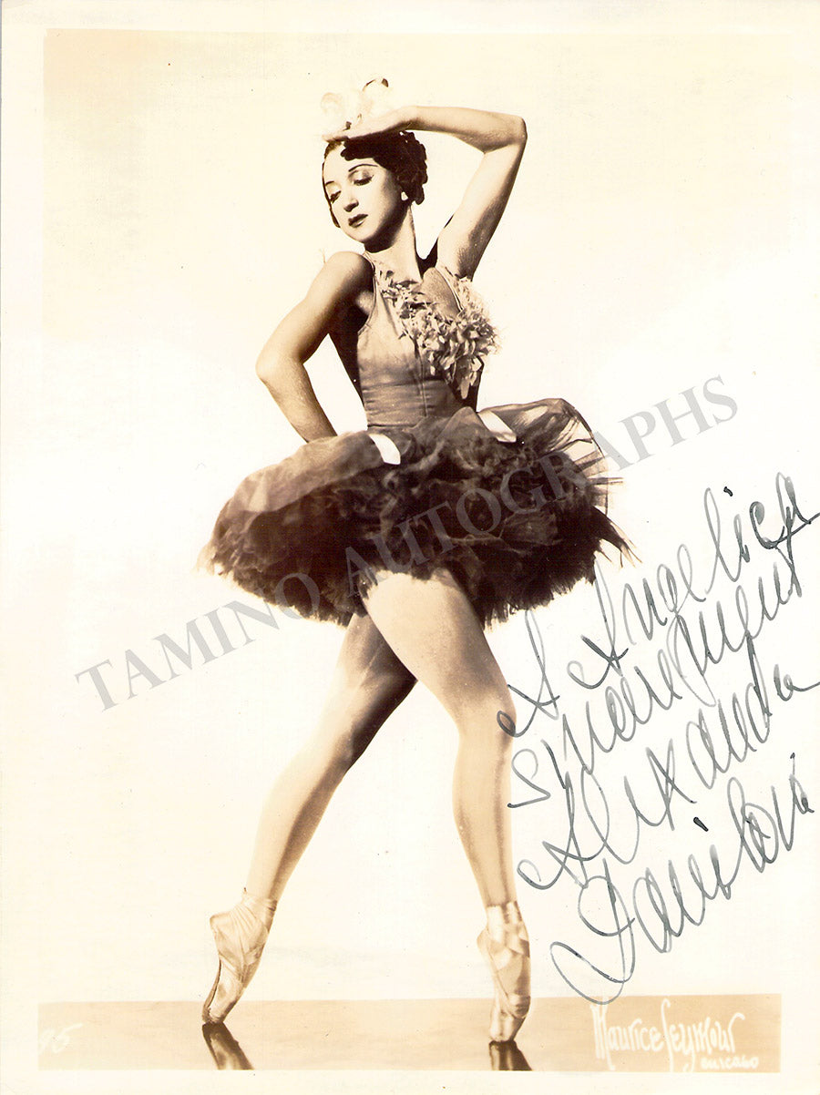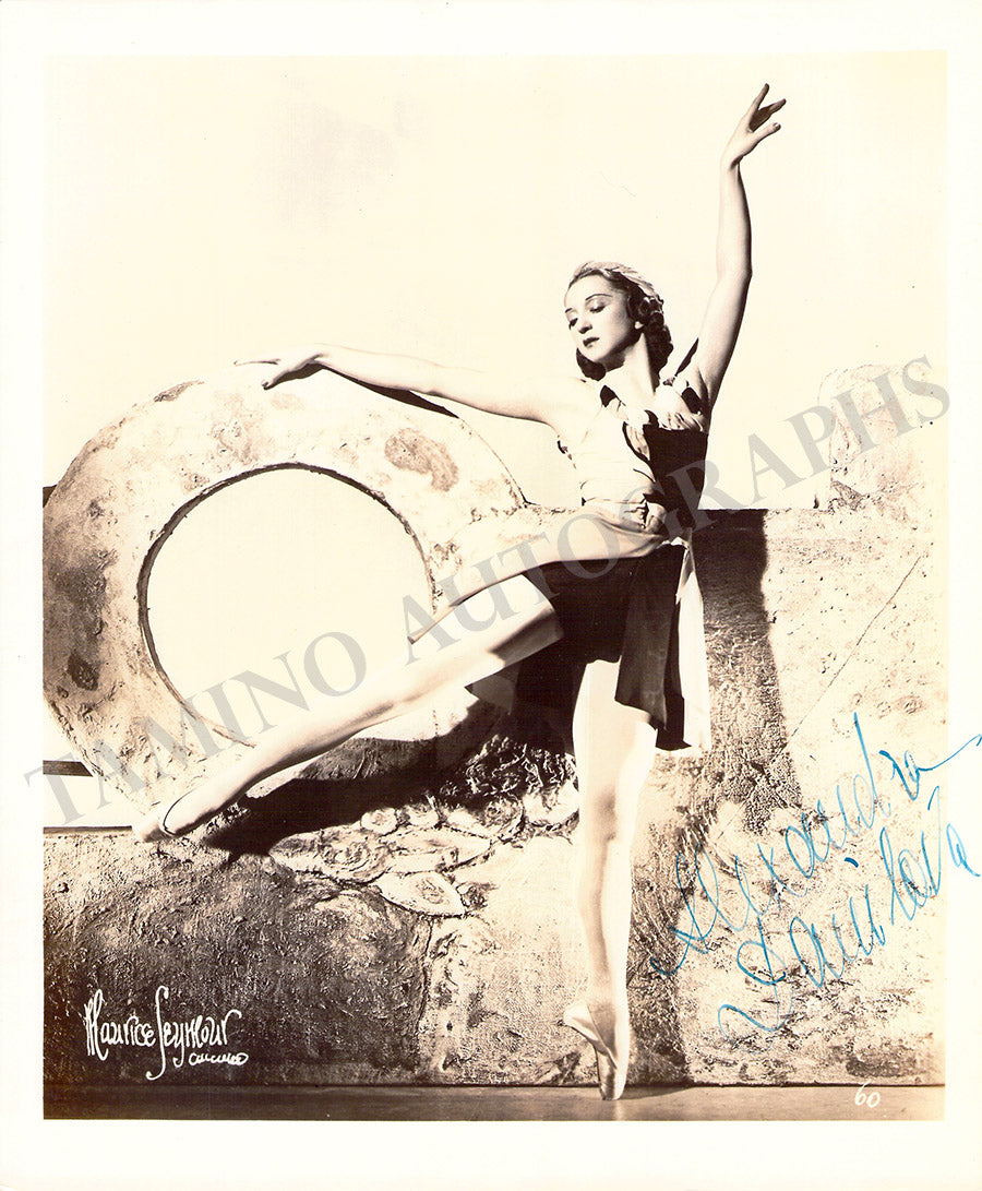 Fine black-and-white photograph signed and inscribed by her with a short sentiment, shown in performance; photo by Maurice Seymour (Chicago). Size is 7.75 x 9.75 inches, mounting traces on verso, in very good condition.