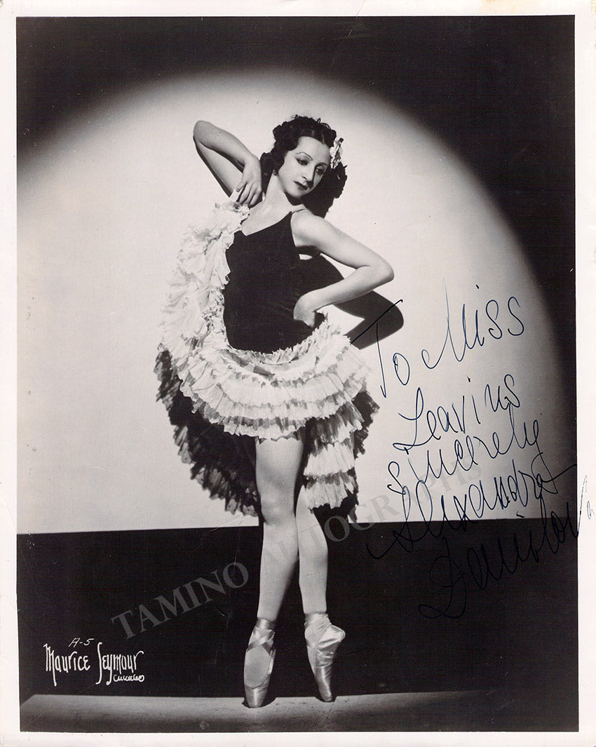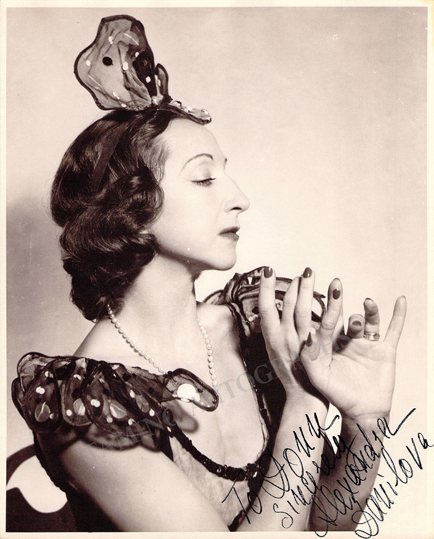 Black-and-white photograph signed by her, shown in performance as Princess Sarara; photo by Ray Studios (New York). Size is 10.1 x 8.1 inches, mounting traces on verso, in very good condition.