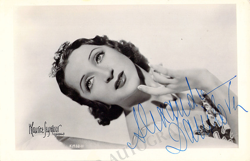 Nice black-and-white photograph signed by her; photo by Maurice Seymour (Chicago). Size is 7.9 x 5.1 inches, in excellent condition.