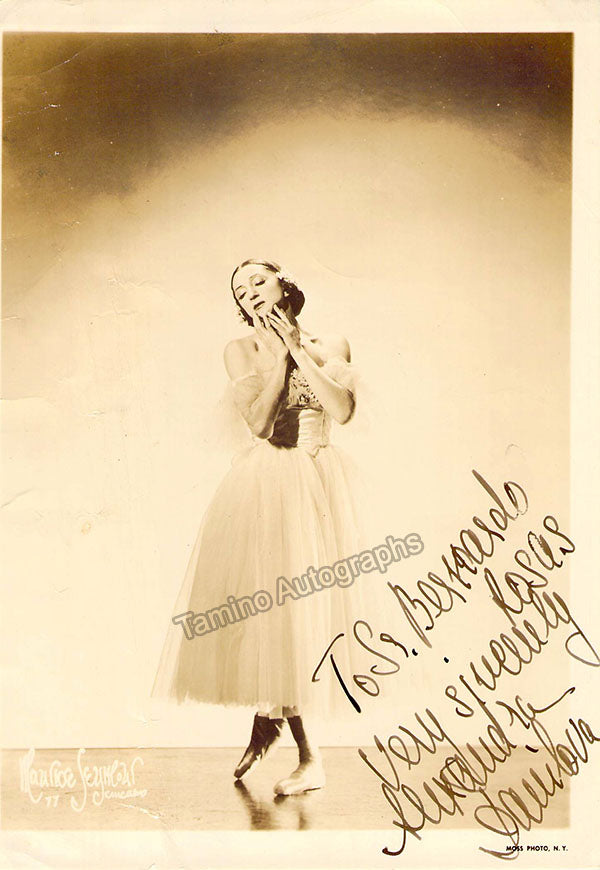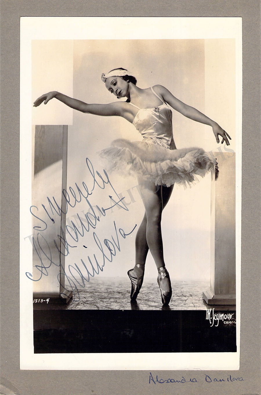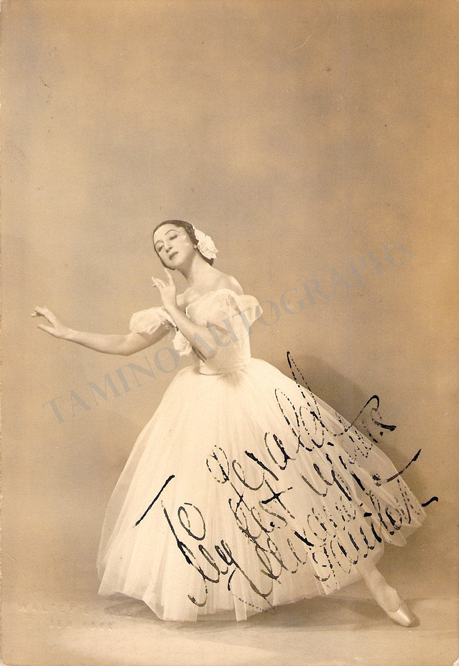 Beautiful sepia photograph signed and inscribed by her with a short sentiment, shown in a ballet pose. Size is 6.3 x 8.5 inches, mounting traces on verso, in very good condition.