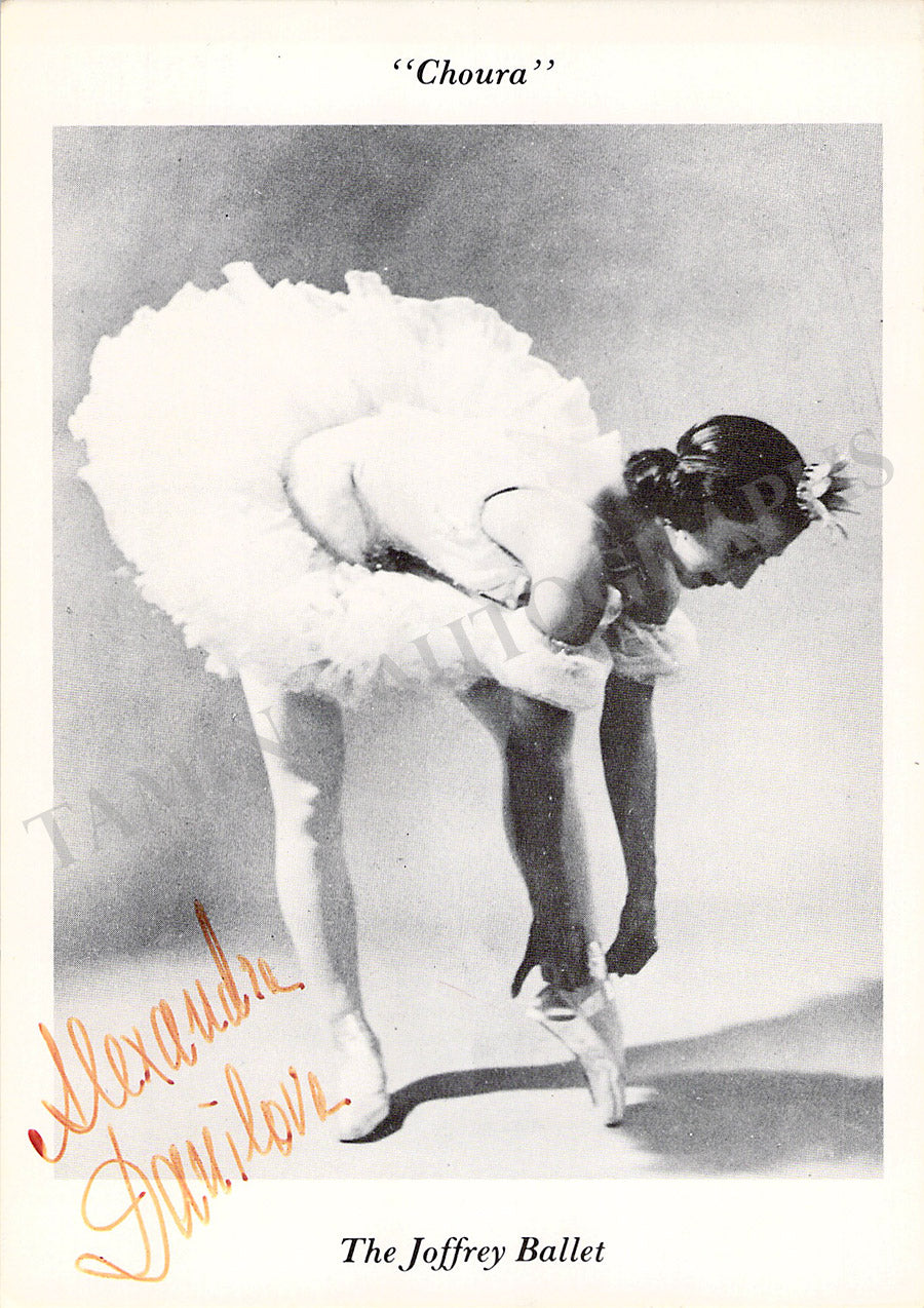 Beautiful black-and-white photograph mounted on cardboard signed by her, shown in a dancing pose. Total size is 5.8 x 8.9 inches, actual photograph is 5 x 8 inches, in excellent condition.