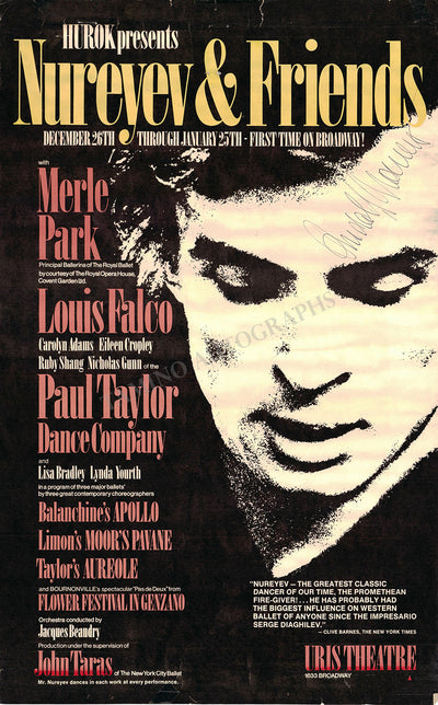 Poster announcing the show 'Nureyev & Friends' on Broadway from December 26, 1974, to January 25, 1975, at Uris Theater, New York, signed by him with a blue ballpoint pen over his forehead. Size is 14 x 22 inches, with some folds and cracks, in overall good condition.