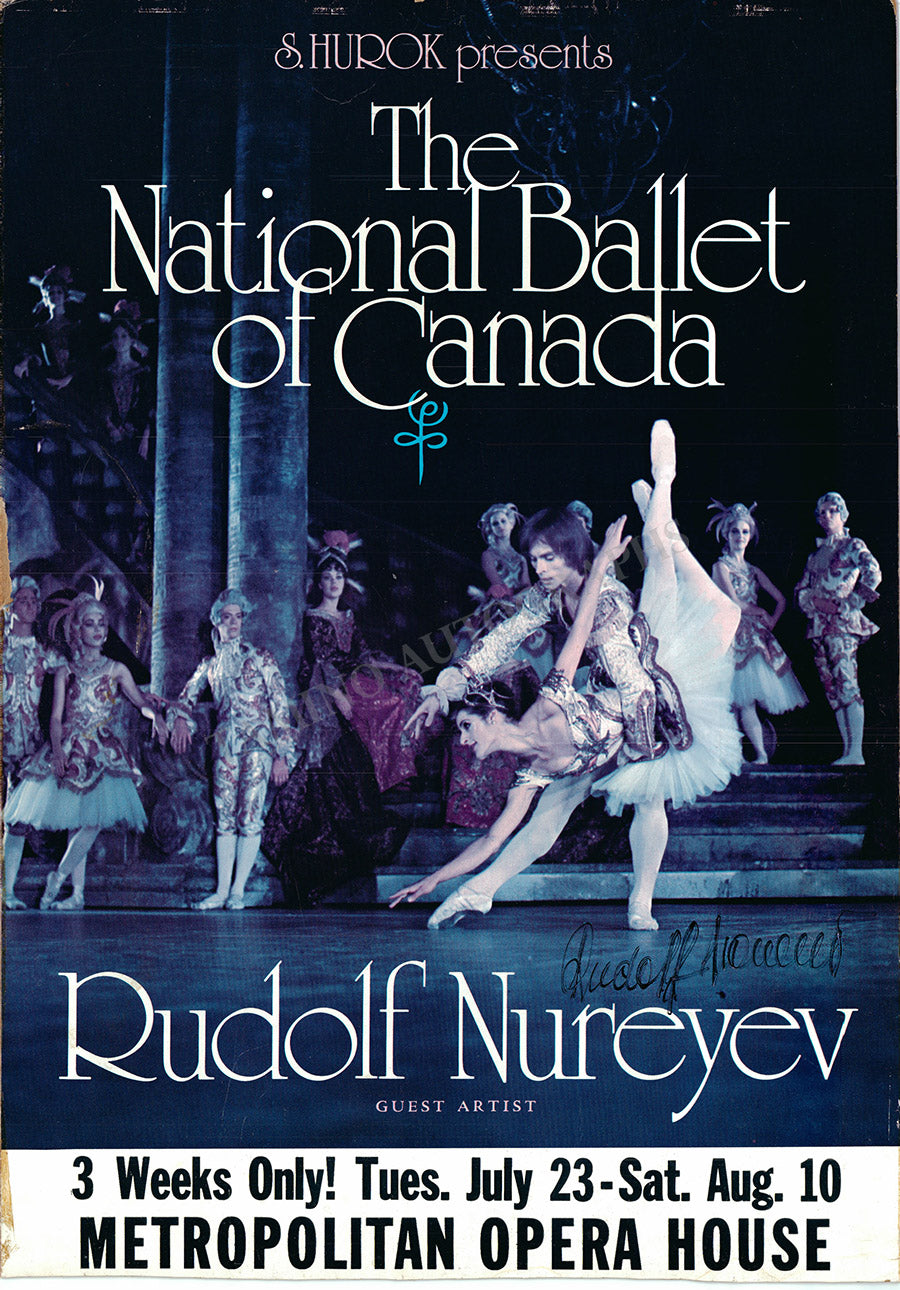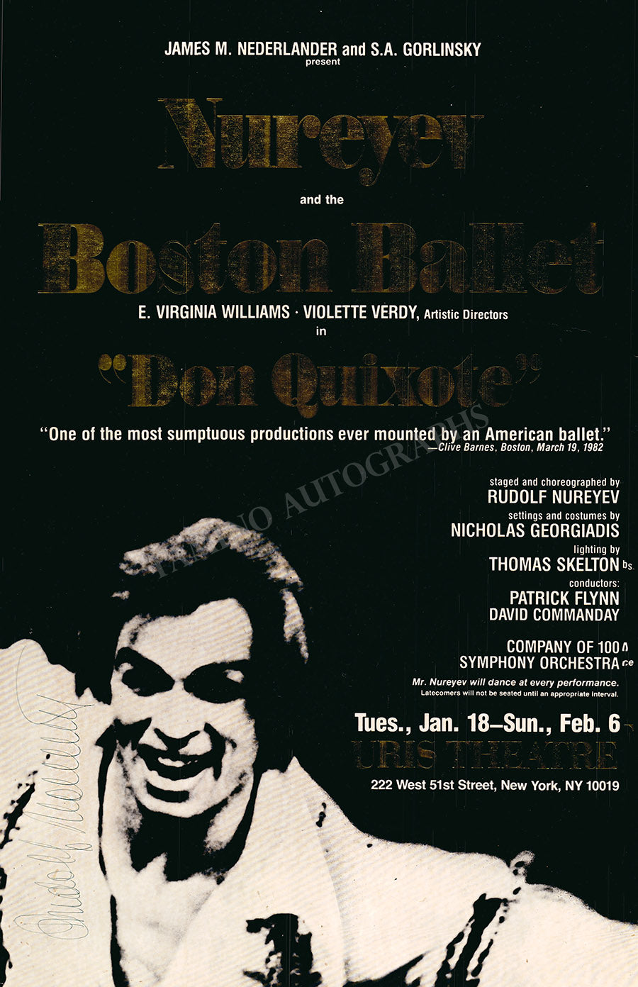 Poster on semi-soft cardboard announcing a performance of 'Don Quixote' at Uris Theater for a 3-week run in 1983 signed by the dancer. Size is 14 x 22 inches, the lettering is not clear in the scan but perfectly clear in the actual poster, one minor crease, otherwise in excellent condition.