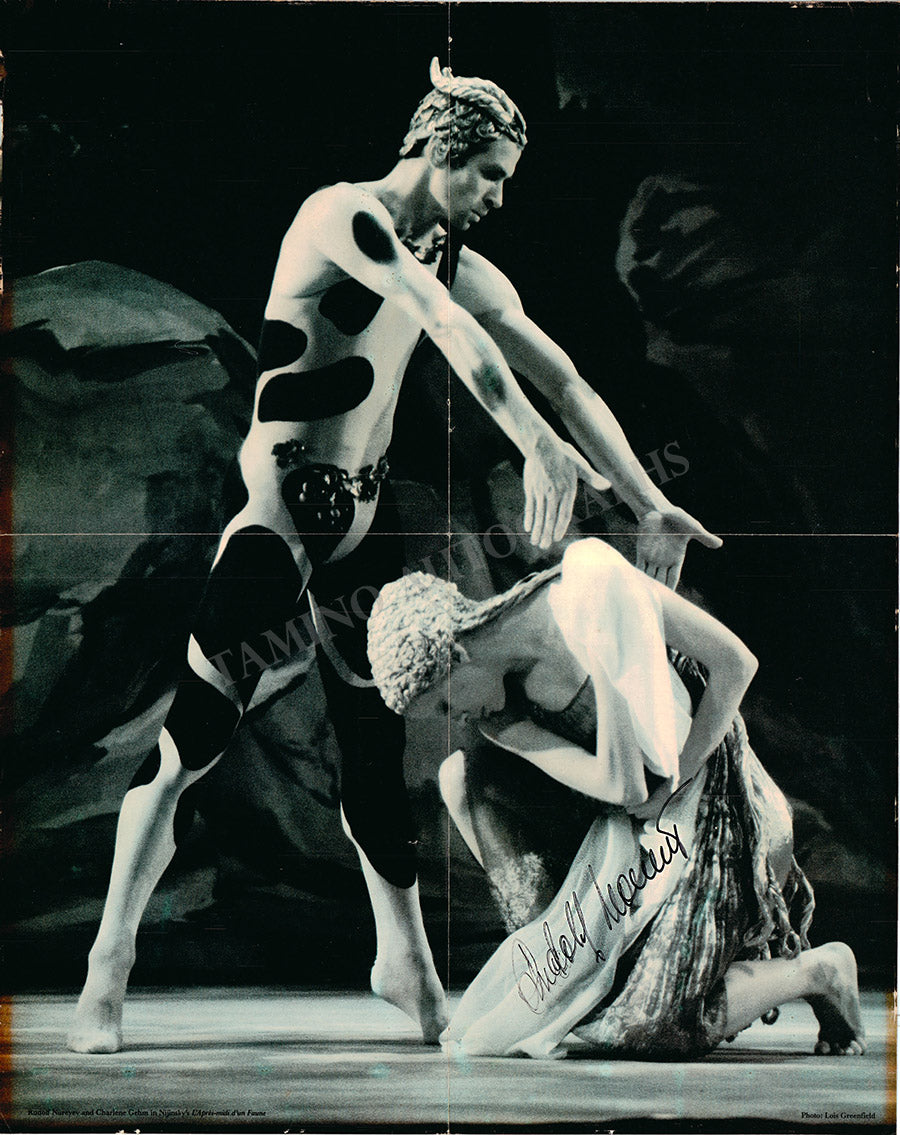 Poster for a tribute to Nijinsky shown performing 'L'Apres d'un Faune' next to Charlene Gehm, signed by him over her skirt. Size is 16 x 20 inches, folding marks, taken from a magazine, in very good condition.